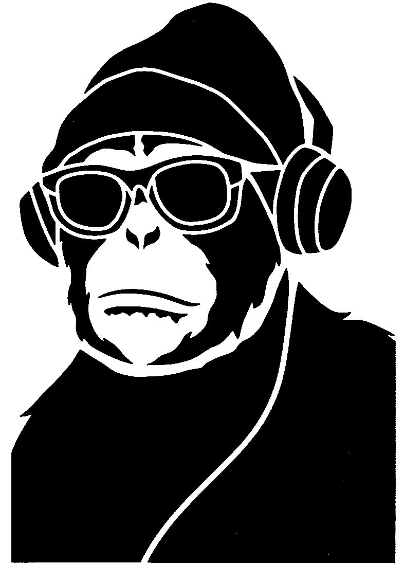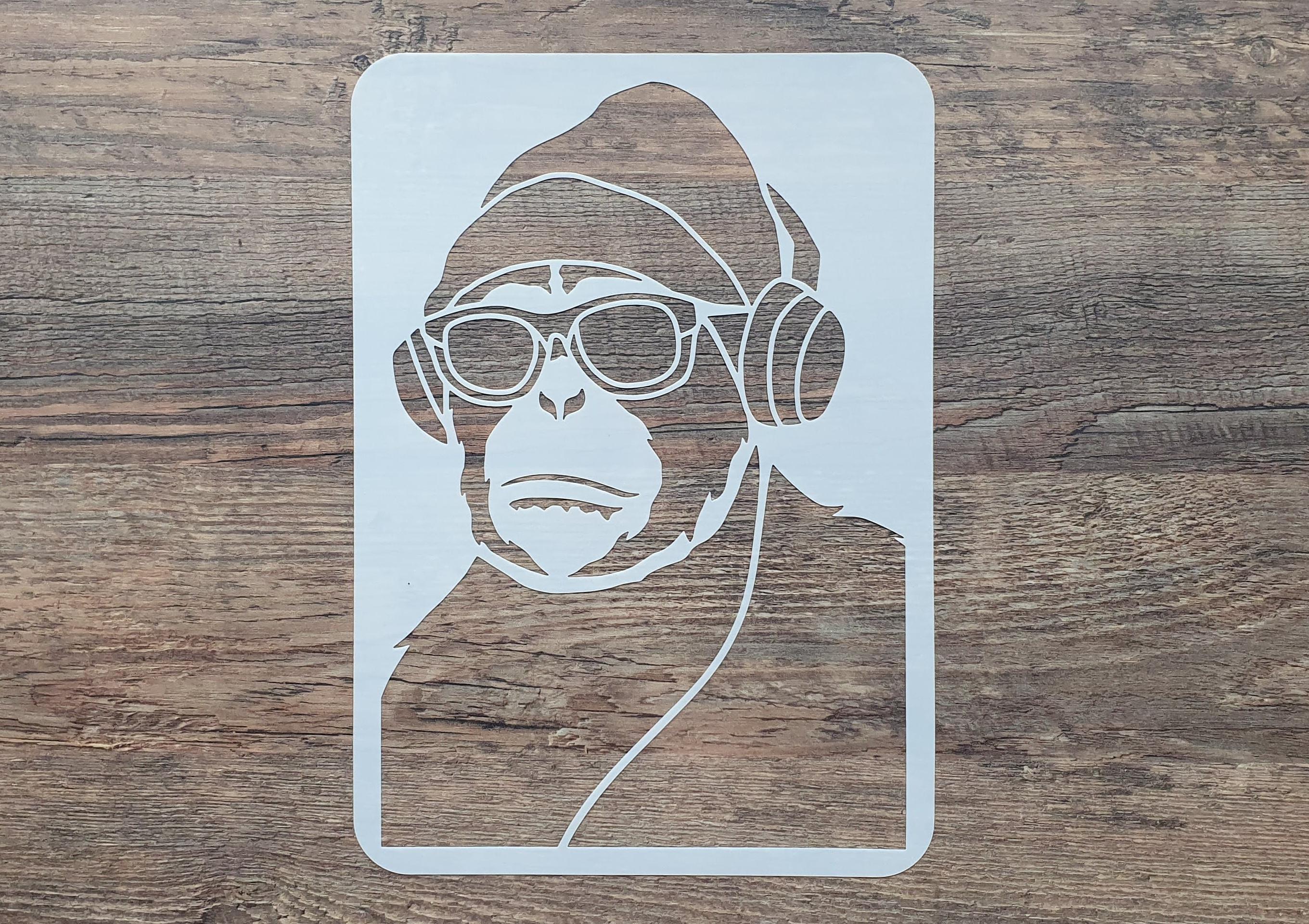 Motiv: Schimpanse mit Beanie, Kopfhörern und Brille